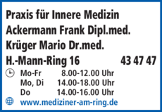 Praxis für Innere Medizin Ackermann F. Dipl.med. hat montags bis dienstags von 08:00 - 12:00 Uhr und 14:00 - 18:00 Uhr, mittwochs von 08:00 - 12:00 Uhr, donnerstags von 08:00 - 12:00 Uhr und 14:00 - 18:00 Uhr und freitags von 08:00 - 12:00 Uhr geöffnet.