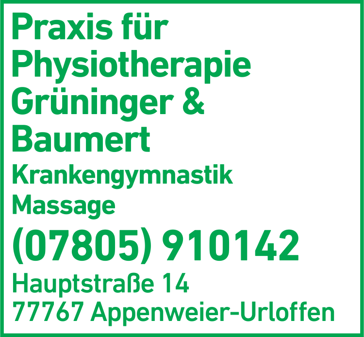 Praxis für Physiotherapie Grüninger & Baumert 07805 91 01 42 Appenweier Hauptstr. 14 77767 Urloffen