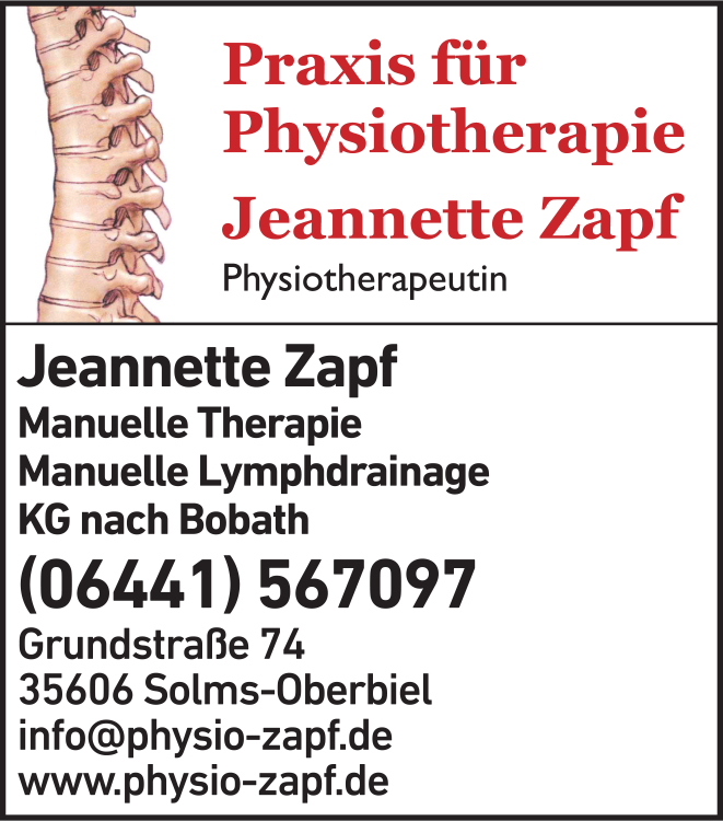 Die Adresse von Praxis für Physiotherapie Jeannette Zapf Krankengymnastik lautet: Grundstr. 74, 35606 Solms-Oberdiel