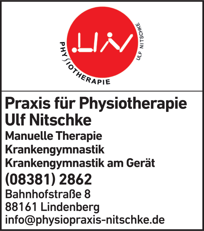 Die Adresse von Praxis für Physiotherapie Ulf Nitschke lautet: Bahnhofstr. 8, 88161 Lindenberg i.Allgäu