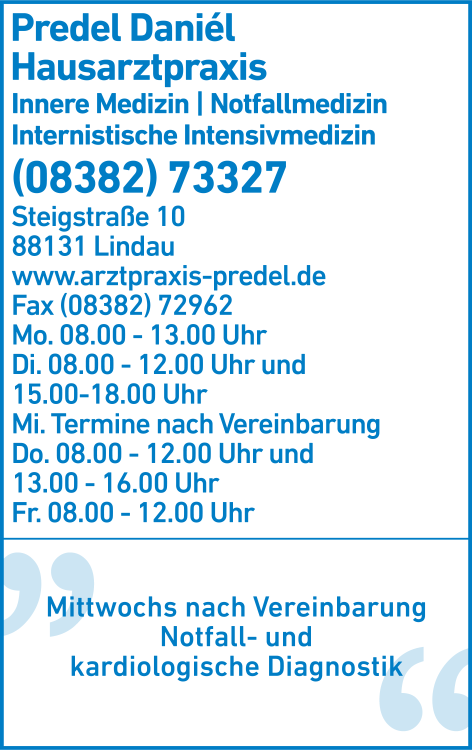 Predel Daniél Hausarztpraxis 08382 7 33 27 Lindau (Bodensee) Steigstr. 10 88131 Reutin de.teleauskunft.oetb.webapp2.detail.Graphic@198f69e0