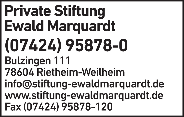 Die Adresse von Private Stiftung Ewald Marquardt lautet: Bulzingen 111, 78604 Rietheim-Weilheim