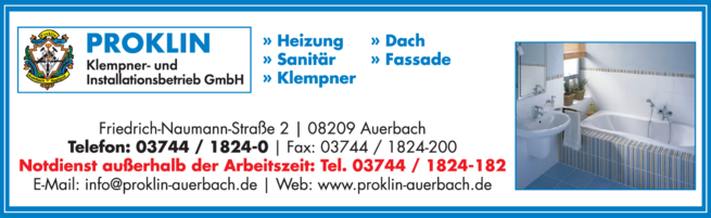 Die Adresse von Proklin Klempner- und Installationsbetrieb GmbH lautet: Friedrich-Naumann-Str. 2, 08209 Auerbach