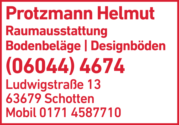 Die Adresse von Protzmann Helmut Raumausstattung lautet: Ludwigstr. 13, 63679 Schotten