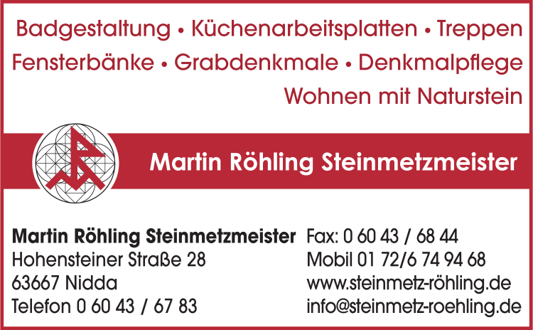 Die Adresse von Röhling Martin Steinmetzmeister lautet: Hohensteiner Str. 28, 63667 Nidda
