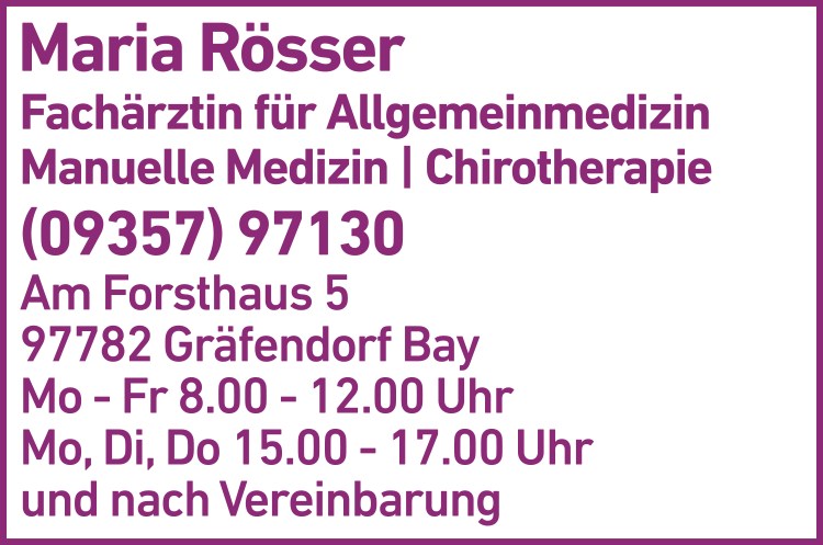 Die Adresse von Rösser Maria Ärztin für Allgemeinmedizin lautet: Am Forsthaus 5, 97782 Gräfendorf Bay