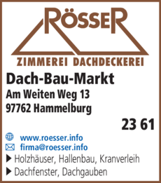 Die Adresse von Rösser Zimmerei lautet: Am Weiten Weg 13, 97762 Hammelburg