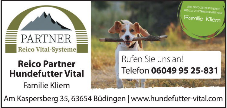 Die Adresse von REICO Partner Hundefutter Vital lautet: Am Kaspersberg 35, 63654 Büdingen