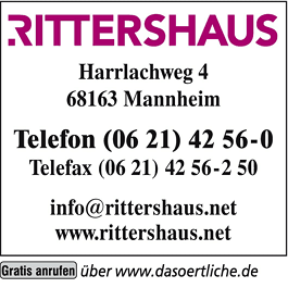 Die Adresse von RITTERSHAUS Rechtsanwälte Partnerschaftsgesellschaft mbB lautet: Harrlachweg 4, 68163 Mannheim