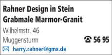Die Adresse von Rahner Design in Stein lautet: Wilhelmstr. 46, 76461 Muggensturm