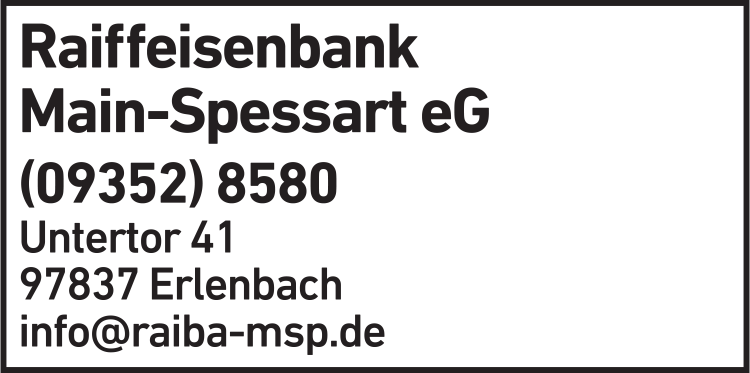 Die Adresse von Raiffeisenbank Main-Spessart eG lautet: Untertor 41, 97837 Erlenbach
