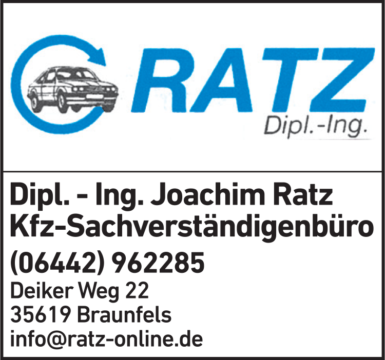 Die Adresse von Ratz Joachim Dipl. - Ing. KFZ-Sachverständigenbüro lautet: Deiker Weg 22, 35619 Braunfels