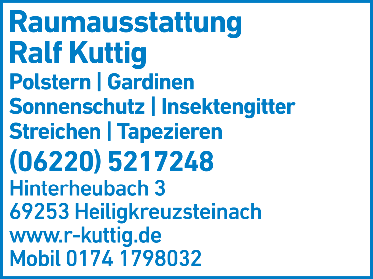 Die Adresse von Raumausstattung Ralf Kuttig lautet: Hinterheubach 3, 69253 Heiligkreuzsteinach