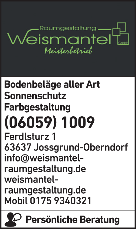 Die Adresse von Raumgestaltung Weismantel GmbH Raumausstatter lautet: Ferdlsturz 1, 63637 Jossgrund-Oberndorf