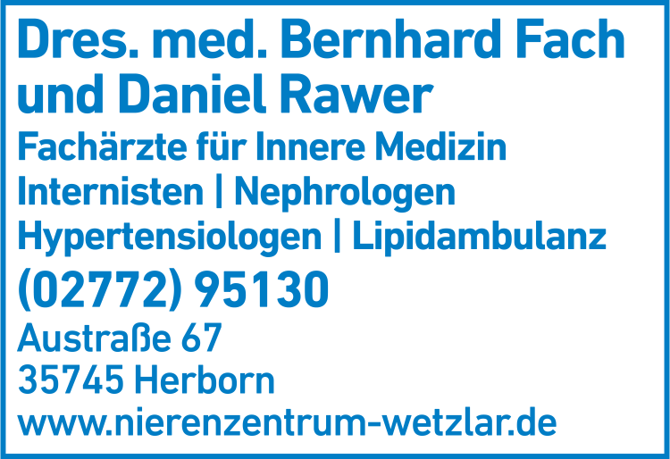 Rawer Daniel und Fach Bernhard Dres. med. Fachärzte für Innere Medizin und Nephrologie 02772 9 51 30 Herborn Austr. 67 35745