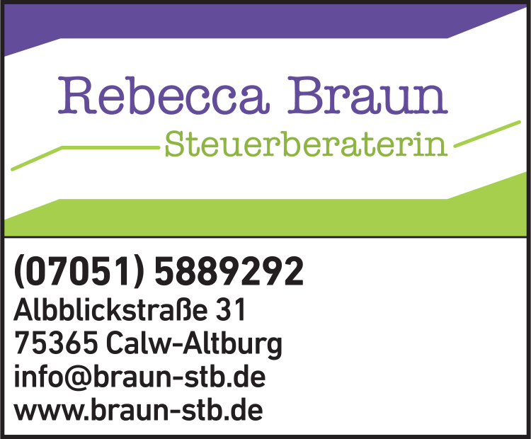 Die Adresse von Rebecca Braun Steuerberatung lautet: Albblickstr. 31, 75365 Calw