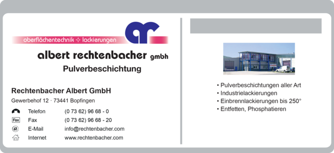 Rechtenbacher Albert GmbH bietet Pulverbeschichtungen, Industrielackierungen, Einbrennlackierungen, Entfetten, Phosphatieren, Fahrzeuglackierungen, Oberflächentechnik, Lackierungen, Lackierereien und Einbrennlackierungen bis 250 Grag an.