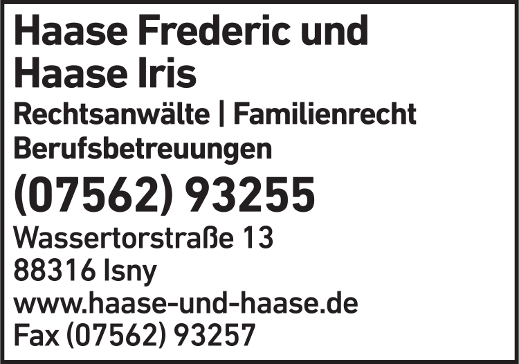Rechtsanwälte Haase Frederic & Haase Iris 07562 9 32 55 Isny Wassertorstr. 13 88316