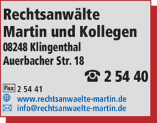 Die Adresse von Rechtsanwälte Martin u. Kollegen lautet: Auerbacher Str. 18, 08248 Klingenthal