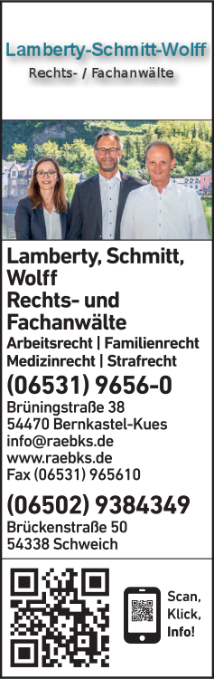 Rechtsanwälte in PartG mbB Schmitt, Wolff, Henkel 06531 96 56-0 Bernkastel-Kues Brüningstr. 38 54470 de.teleauskunft.oetb.webapp2.detail.Graphic@18f63402
