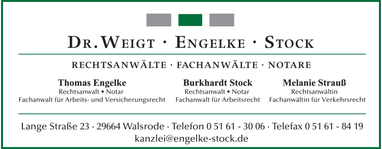 Rechtsanwälte u. Notare Engelke u. Stock 05161 30 06 Walsrode Lange Str. 23 29664