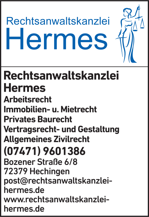 Die Adresse von Rechtsanwaltskanzlei Hermes lautet: Bozener Str. 6/8, 72379 Hechingen