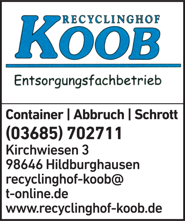 Die Adresse von Recyclinghof Koob Entsorgungsfachbetrieb Inh. Michael Koob lautet: Kirchwiesen 3, 98646 Hildburghausen