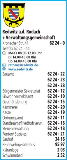 Wie sind die Öffnungszeiten von Redwitz a.d. Rodach und Verwaltungsgemeinschaft?