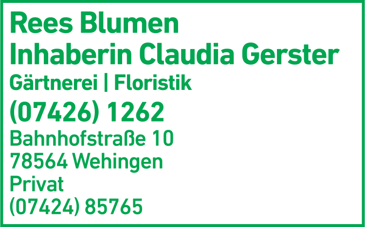 Die Adresse von Rees Gärtnerei & Floristik Inh. Claudia Gerster lautet: Bahnhofstr. 10, 78564 Wehingen