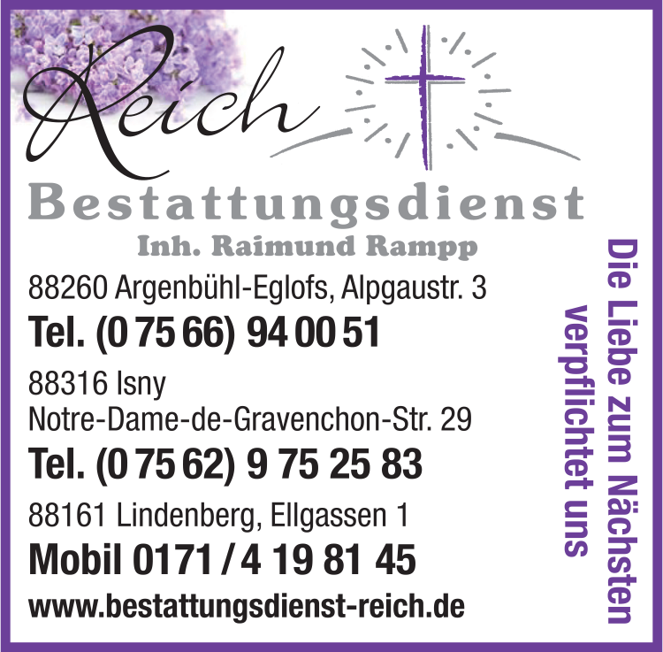 Reich Inh. Raimund Rampp Bestattung 07566 94 00 51 Argenbühl-Eglofs Alpgaustr. 3 88260