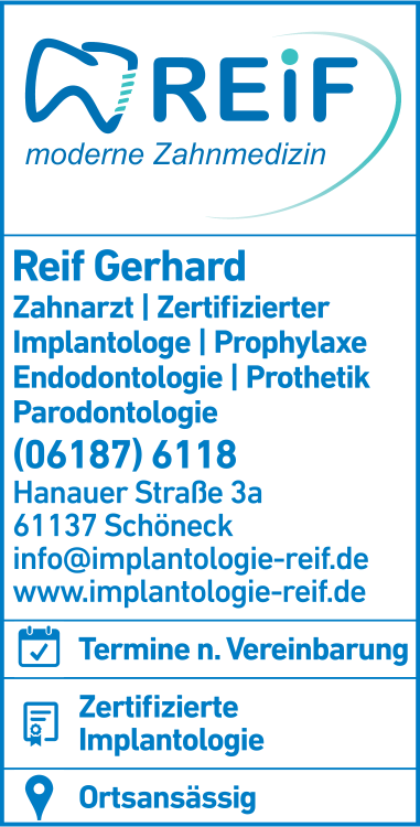 Die Adresse von Reif Gerhard Zahnarzt lautet: Hanauer Str. 3 a, 61137 Schöneck
