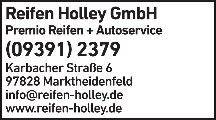 Die Adresse von Reifen Holley GmbH, Premio Reifen- + Autoservice lautet: Karbacher Str. 6, 97828 Marktheidenfeld