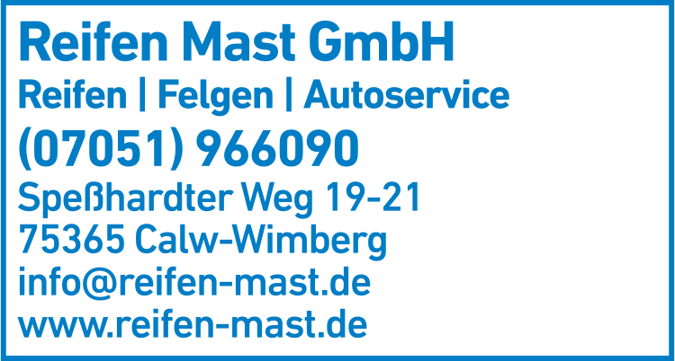 Reifen Mast GmbH 07051 96 60 90 Calw-Wimberg Speßhardter Weg 19-21 75365