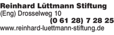 Die Adresse von Reinhard Lüttmann Stiftung lautet: Drosselweg 10, 65527 (Eng)