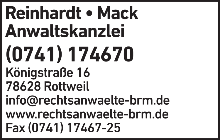 Die Adresse von Reinhardt - Mack Anwaltskanzlei Rechtsanwälte lautet: Königstr. 16, 78628 Rottweil
