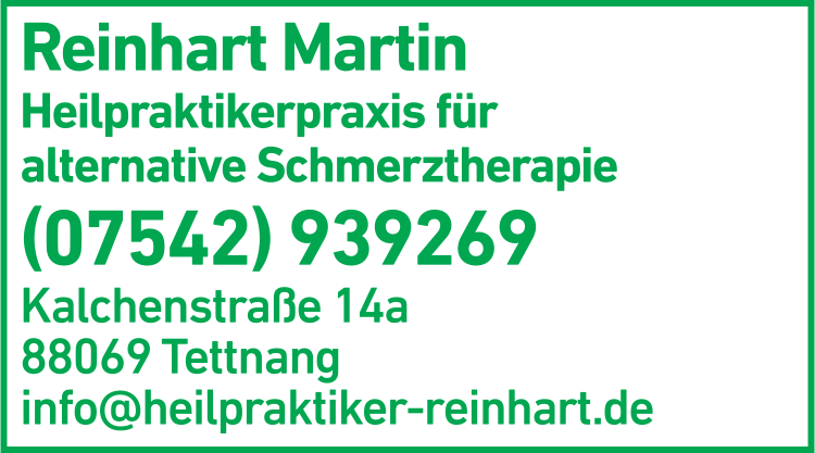 Die Adresse von Reinhart Martin lautet: Kalchenstr. 14 a, 88069 Tettnang