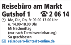 Reisebüro am Markt hat montags bis freitags von 09:00 - 13:00 Uhr und 14:00 - 18:00 Uhr geöffnet.