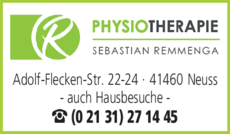 Wirbelsäulentherapie, physikalische Therapie, Bewegungstherapie und noch viele weitere Behandlungen bietet Ihnen die Praxis für Physiotherapie Sebastian Remmenga in Neuss. Die etablierte Praxis wird Sie mit erstklassigen Behandlungen und einem einfühlsamen Umgang begeistern. Die freundlichen und hervorragend ausgestatteten Räumlichkeiten bieten die perfekte Umgebung für Ihre Genesung. Weiterhin bietet Ihnen die Praxis eine mobile Physiotherapie an, in deren Rahmen Ihnen das Praxisteam Hausbesuche abstattet. Sehr viele ältere Personen und Menschen mit einer eingeschränkten Mobilität nehmen diesen komfortablen Service gerne an. Selbstverständlich dürfen Sie die meisten Angebote der Praxis auch ohne ärztliches Rezept wahrnehmen. |