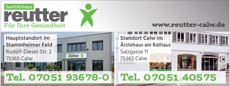 Die Adresse von Reutter Sanitätshaus lautet: Salzgasse 11, 75365 Calw