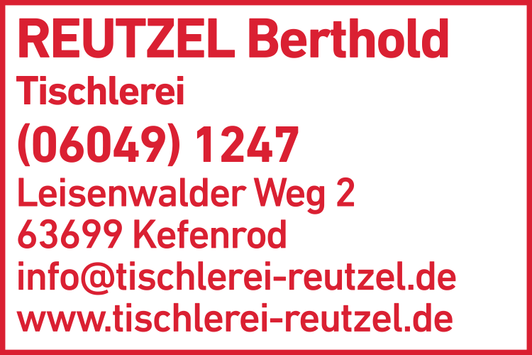 Die Adresse von Reutzel Berthold Tischlerei lautet: Leisenwalder Weg 2, 63699 Kefenrod