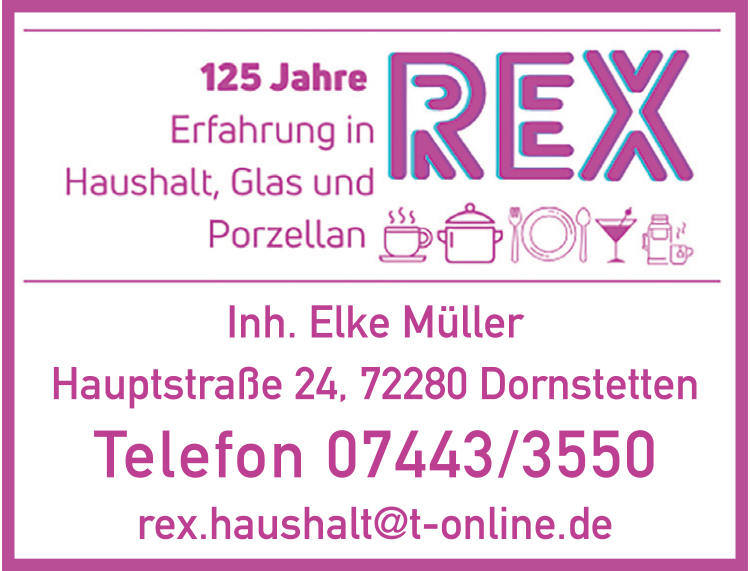 Die Adresse von Rex Haushaltswaren Inh. E. Müller lautet: Hauptstr. 24, 72280 Dornstetten