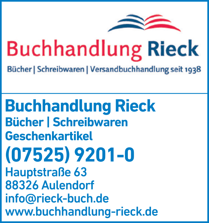 Die Adresse von Rieck Buchhandlung lautet: Hauptstr. 63, 88326 Aulendorf