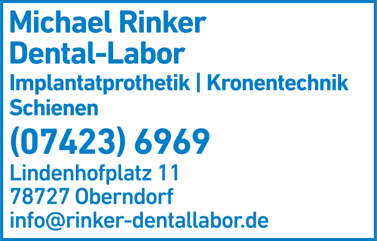 Die Adresse von Rinker M. Dentallabor lautet: Lindenhofplatz 11, 78727 Oberndorf