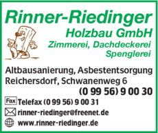 Rinner-Riedinger Holzbau GmbH bietet Zimmerei, Altbausanierung, Dachdeckerei, Spenglerei, Asbestentsorgung, Holzbau, Holzrahmenbau und Zimmereien an.