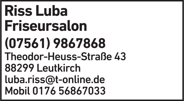 Die Adresse von Riss Luba Friseursalon lautet: Theodor-Heuss-Str. 43, 88299 Leutkirch