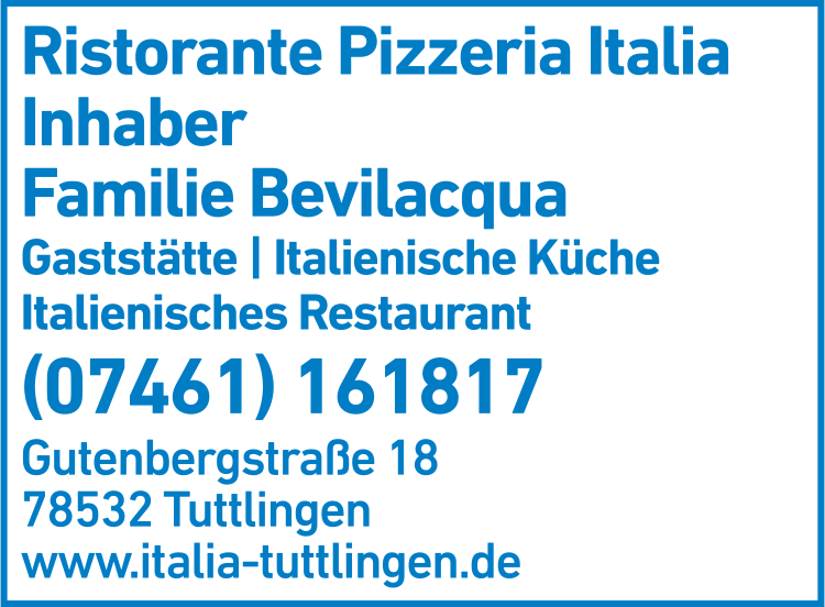 Die Adresse von Ristorante Pizzeria Italia lautet: Gutenbergstr. 18, 78532 Tuttlingen