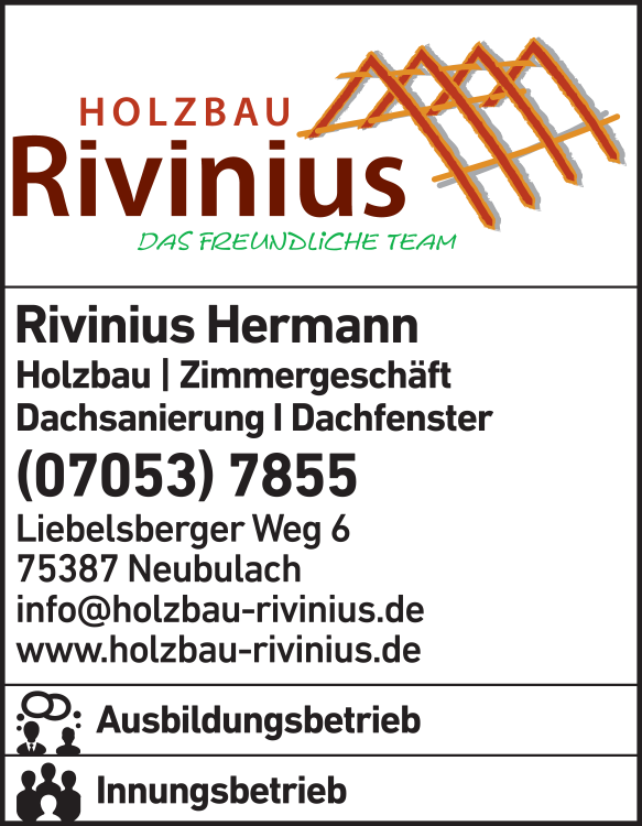 Die Adresse von Rivinius Hermann Zimmergeschäft Holzbau lautet: Liebelsberger Weg 6, 75387 Neubulach