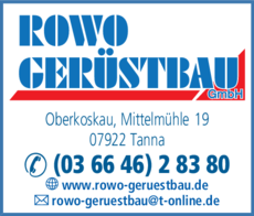 Die Adresse von RoWo Gerüstbau GmbH lautet: Mittelmühle 19, 07922 Tanna