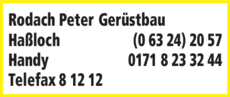 Die Adresse von Rodach Peter lautet: Kirchgasse 237, 67454 Haßloch