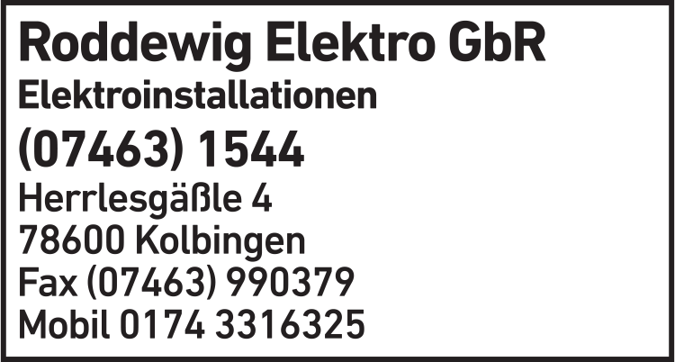 Roddewig Elektro GbR 07463 15 44 Kolbingen Herrlesgäßle 4 78600
